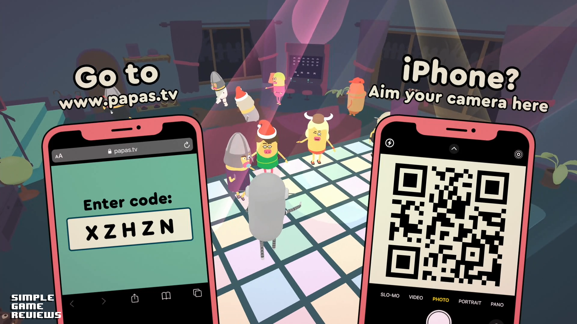 Papa’s Quiz is a party/trivia game for up to 8 players. Players can either use a controller, phone, tablet, or any web browser to play the game. Much like the Jackbox games, you will go to a website and use the game code on the game screen to enter the game or you can scan the QR code instead. The “controls” appear on the screen of your chosen device for players using a mobile device or web browser. They are simply four colored buttons that resemble controller face buttons.